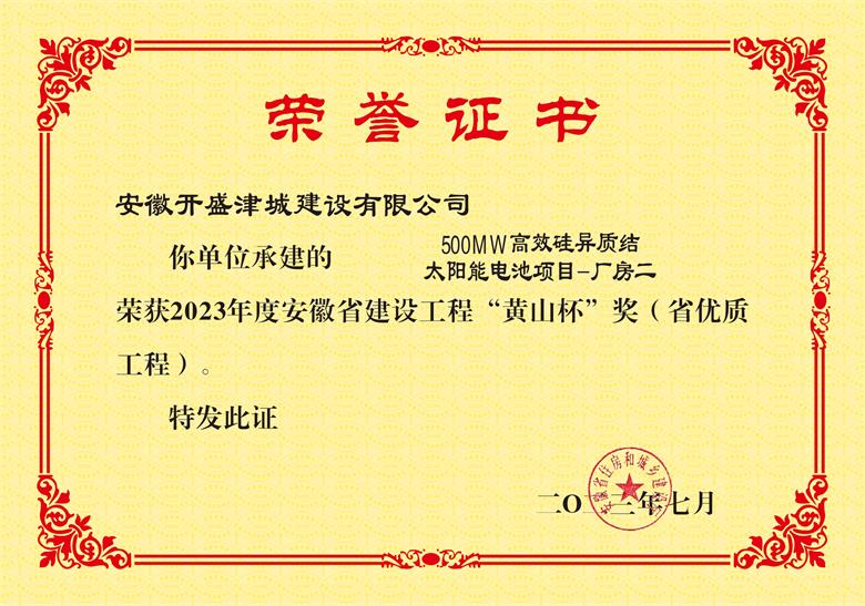 黃山杯--“500MW高效硅異質結太陽能電池項目-廠房二”